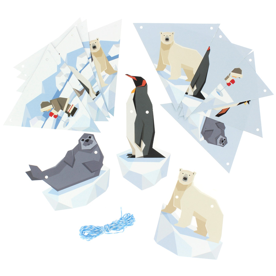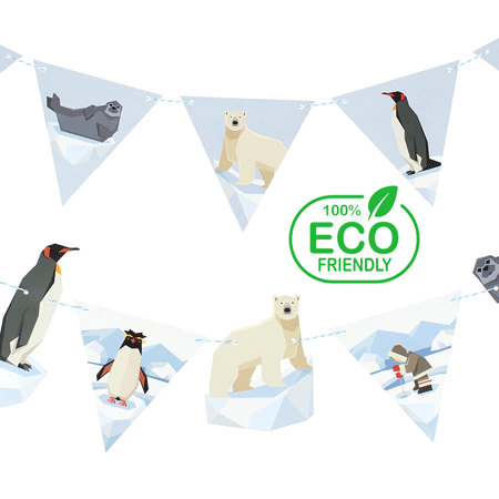 Eine hübsche Girlande aus Recyclingpapier auf 12 kleinen Wimpel mit Arktismotiven sowie mit den Figuren dem Eisbär, dem Pinguin und der Robbe für eine tolle Dekoration!