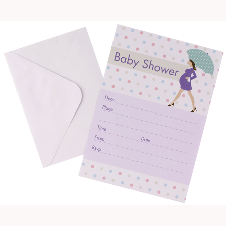 Ganz süß mit lila Punkten und einer Frau mit Babybauch und Schirm! Einladungstext in engl. Sprache
