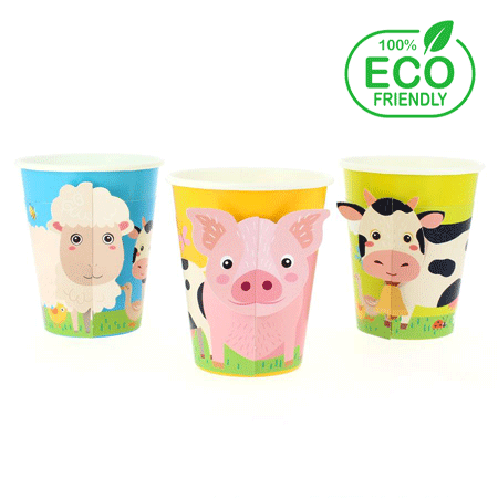 6 Bauernhof Becher (250ml). Das Schaf, das Schwein und die Kuh haben sich auf diesen kompostierbaren Bechern verabredet, gekleidet in wiederverwertbare Papierhüllen, die ihre tollen Silhouetten zeigen.