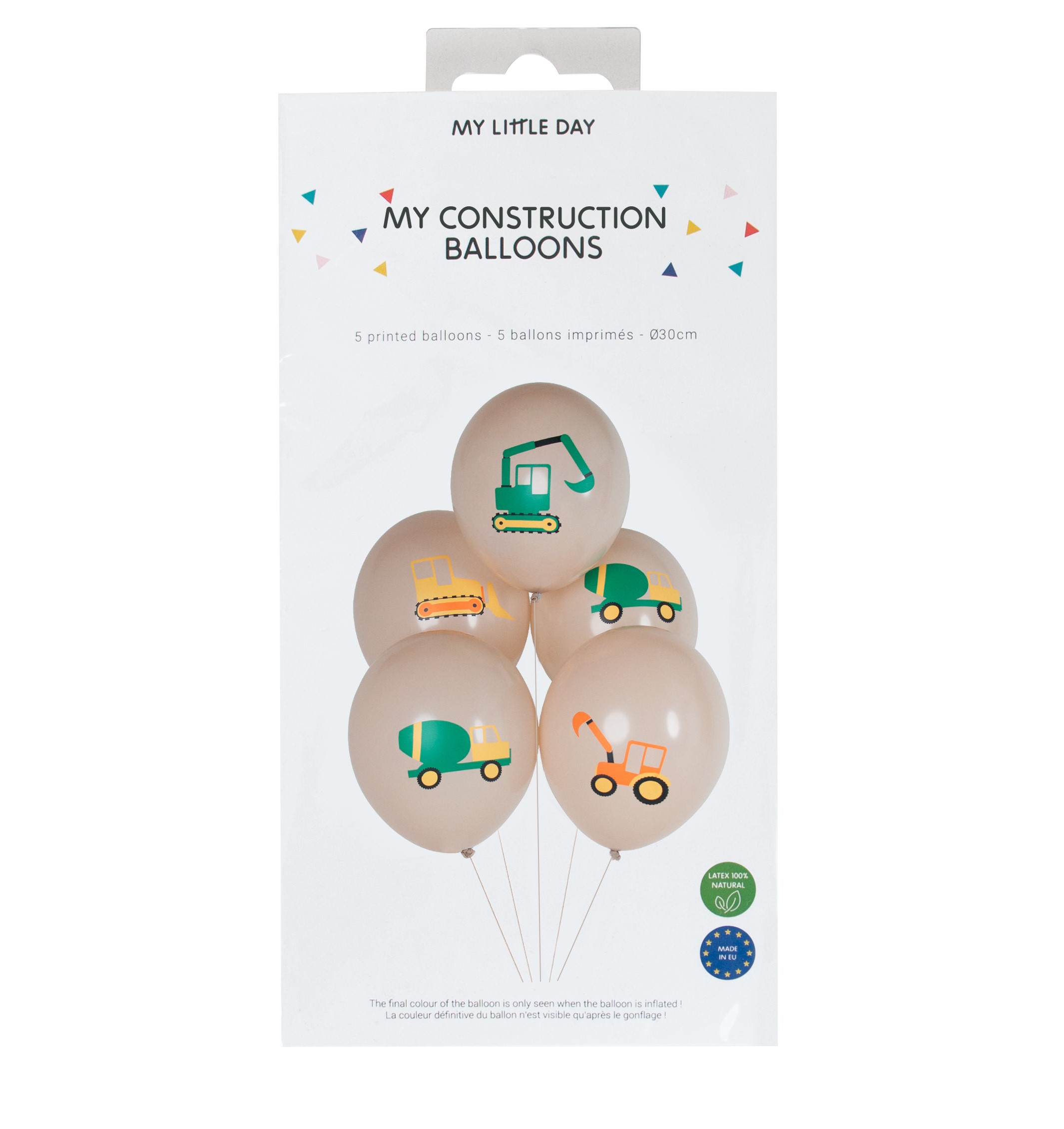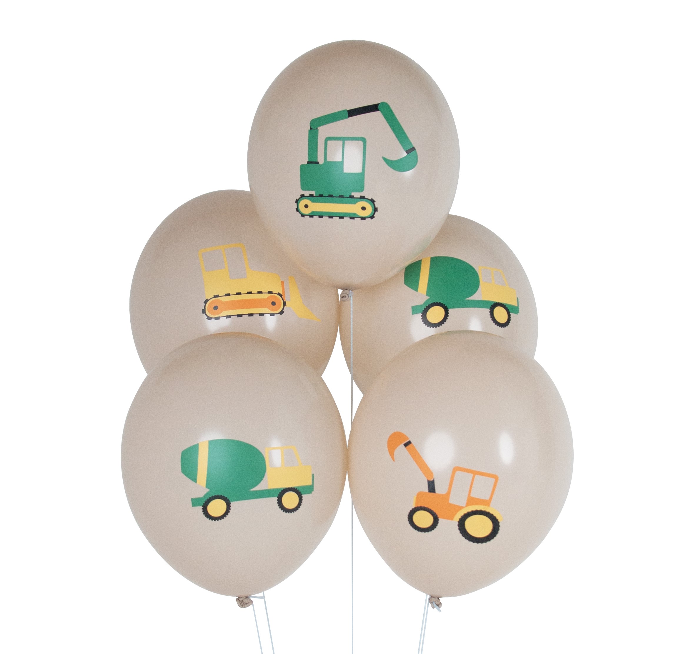 5 Luftballons aus Naturlatex (Farbe: beige), zweiseitig bedruckt (bunt) mit Radlader, Betonmischer, Bagger etc.