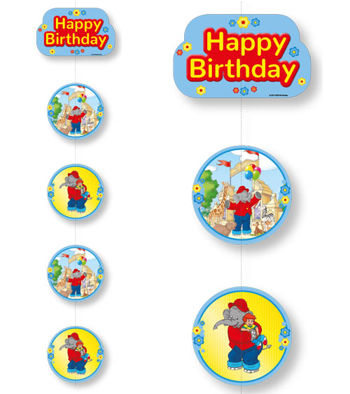 Kopfteil 25cm x 15cm mit Happy Birthday-Aufschrift und 4 runde Schilder 18 x 18cm beidseitig bedruckt, zusammengenäht