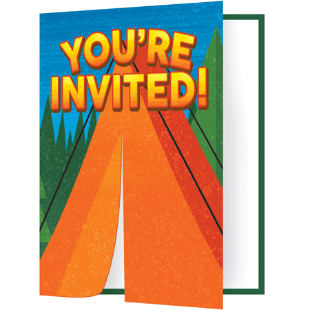 8 tolle Party Einladungskarten für Lagerfeuerliebhaber, Pfadfinder im Zeltlager und Camper.