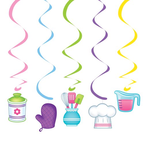 Hängedekoration mit 5 verschiedenen Dekoteilen wie Messbecher, Kochmütze, Kochlöffel, Backhandschuh und Aufbewahrungsdose. Ein schöner Hingucker auf der Party.