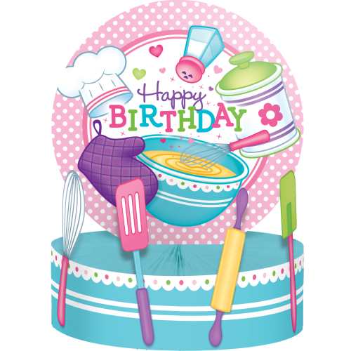 Tischdeko zum Aufstellen mit einem Wabenaufsteller und lauter Utensilien wie Schneebesen, Kochlöffel Teigrolle sowie weitere Küchenteile runden den Tischaufsteller ab. Der Hingucker auf der Party.