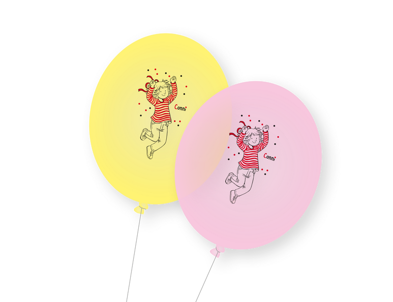 8 Luftballons aus Naturlatex (gelb und rosa), zweiseitig bedruckt (schwarz/bunt) mit Conni Aufdruck.