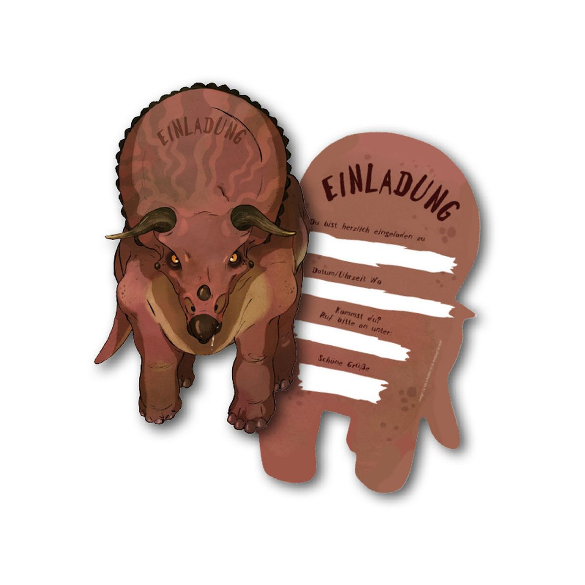 6 Einladungskarten in deutscher Sprache in Dinoform (10,5x17cm), , beidseitig bedruckt