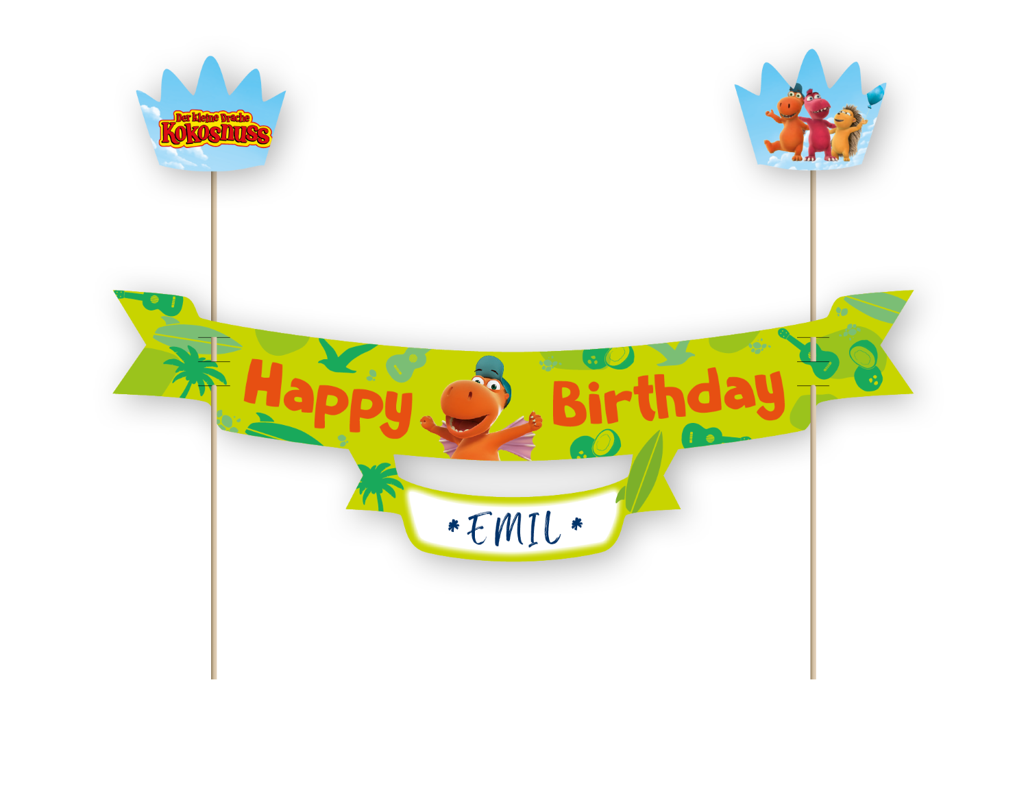 Wenn schnell die Lieblingstorte in eine Drache Kokosnuss Torte gestaltet werden soll, dann ist dieser Tortenbanner genau richtig. Wunderbar mit der Aufschrift "Happy Birthday" und Platz für den Namen des Kindes ist auch vorgesehen. Damit wird euer Kind überrascht und ein echter Hingucker für die Geburtstagstafel. Einfach die beiden Stäbe in die Torte stecken. Vorher noch schnell den Namen des Kindes eintragen und den Banner einstecken.