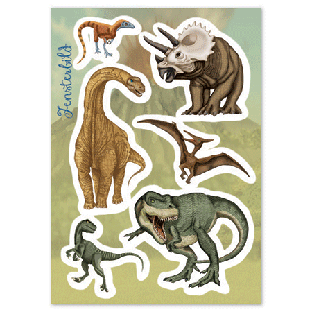 Schönes, postkartengroßes Fensterbild mit Dinosaurier Motiven aus der Feder TapirElla von Lutz Mauder