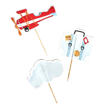 12 Picker (4 Flugzeuge, 4 Koffer und 4 Wolken) aus Pappe mit Holzpicker - 8 cm