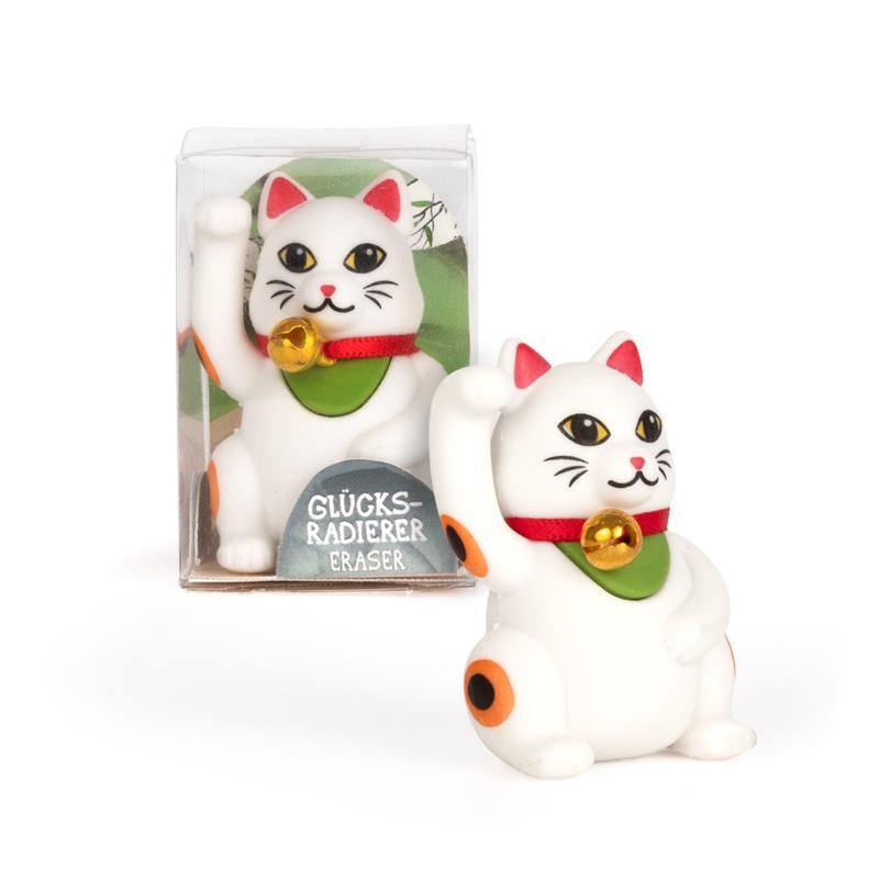 Winke das Glück herbei! Diese einzigartige Radierer-Katze inkl. Metallglöckchen & Satinband ist ein ganz besonderer Blickfang auf dem Schreibtisch! Der Radierer unterstützt mit seiner glücklichen Ausstrahlung auch bei schwierigen Aufgaben!