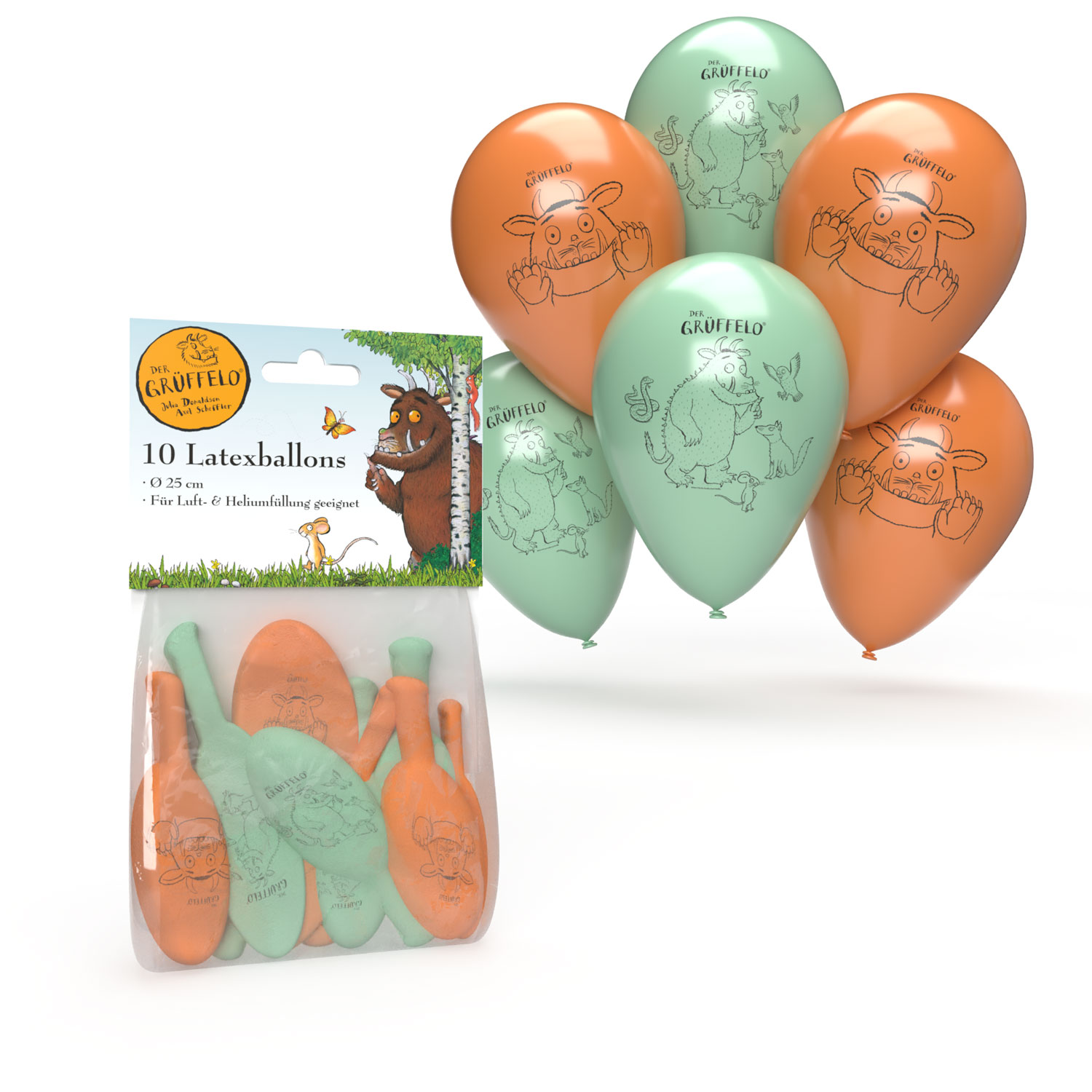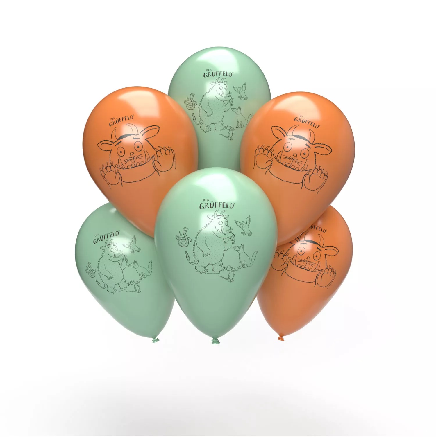 Luftballons aus der Serie "Der Grüffelo" in den Farben türkis und orange mit schwarzem Aufdruck