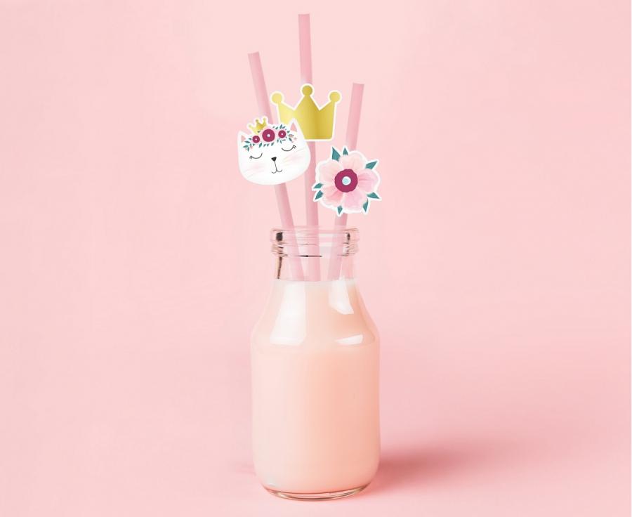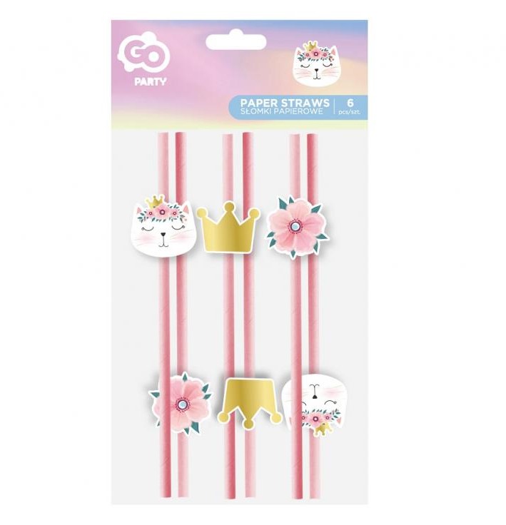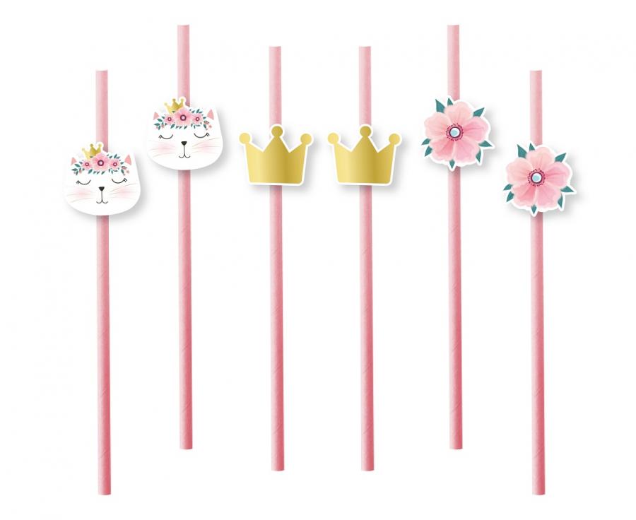 6 stabile und feste Trinkhalme aus Papier mit Pappschilder (Blume, Krone, Kätzchenkopf) für die Kätzchen Party