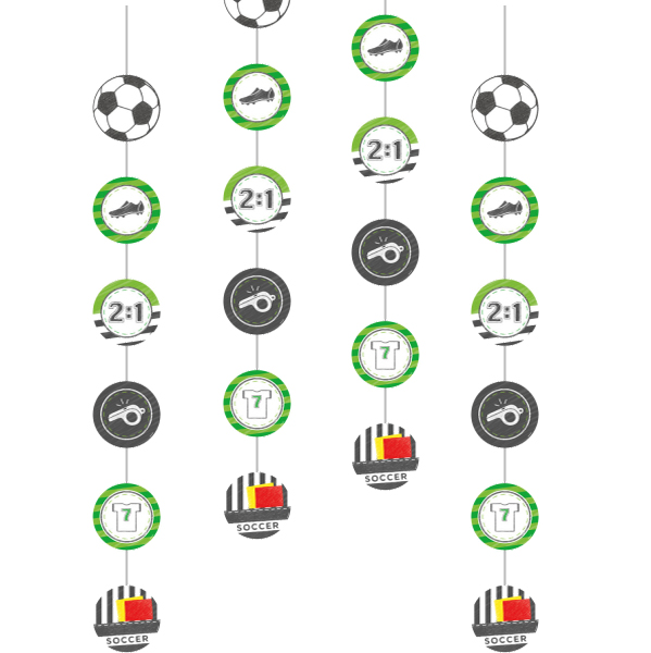 Fußball Dekoration schnell gemacht. Mit diesen 4 Hängedekos ist klar, was für eine Party stattfindet. Die Motive von Fußball, Torverhältnis, Fußballschuh, Schiedsrichter Pfeife, Trikot und die berühmten gelb, rote Karten.