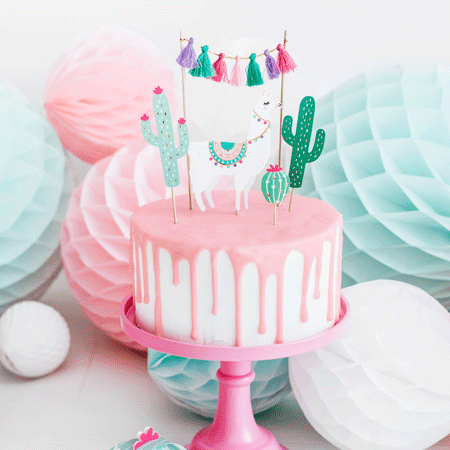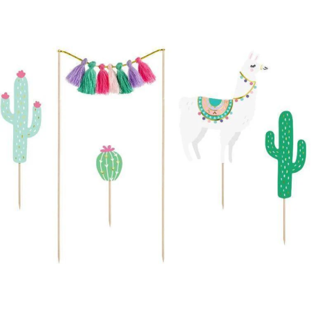 Das 5tlg. Set enthält eine Bommelgirlande mit sieben kleinen Bommeln in Lila, Pink, Rosa und Türkis, die an einem goldglitzerndem Faden an zwei dünnen Holzstäbchen befestigt sind. Außerdem sind noch vier weitere Topper enthalten. Ein großes weißes Lama sowie drei Kakteen in unterschiedlichen Formen und Größen..