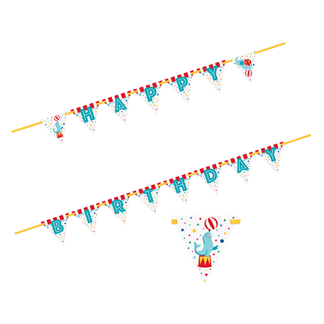 Für die lustige Zirkusparty eine wunderschöne Happy Birthday Girlande. 15 Flaggen (15cm x 15cm) mit einem Satinband durchzogen.
