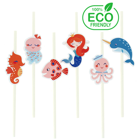 6 Meerjungfrau Papierstrohhalme mit den Bewohnern der Meere. Perfekt abgestimmt mit den Bechern und anderen Artikeln des gleichen Themas, werden diese ökologischen Strohhalme von der schönsten Wirkung für eine Natur-Geburtstagsfeier sein.