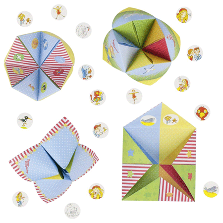 Nenne mir eine Zahl und Peggy sagt dir, was du machen musst." Nach dem Falten wird das "Himmel und Hölle" -Spiel mit Aufklebern versehen, auf denen Peggy zeigt, was gemacht werden soll. Zudem sorgen 16 Blatt Papier (20 x 20 cm) und 192 Sticker für langanhaltende Origami-Beschäftigung an grauen Regentagen.