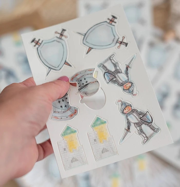 Die Rittermotive sind bereits vorgestanzt. Ohne Mühe direkt aus dem Bogen nehmen und die Tafel mit Ritter, Ritterhelm, Burg und Schild mit Schwert dekorieren