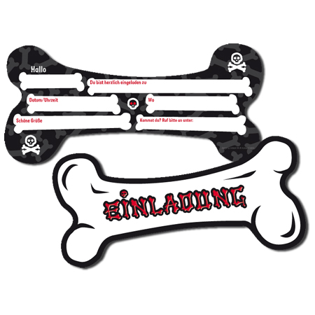 6 Einladungskarten – Knochen Set bestehend aus 6 Einladungskarten in Knochen-Form (20,5 x 11 cm) beidseitig bedruckt im PE Beutel mit Kopfkarte