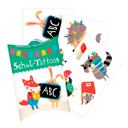 Schultattoos in der Schachtel mit 3 Bögen (je Bogen 8cm x 5,5cm) mit insg. 12 Tattoos (3 Bögen mit 4 Tattoos)