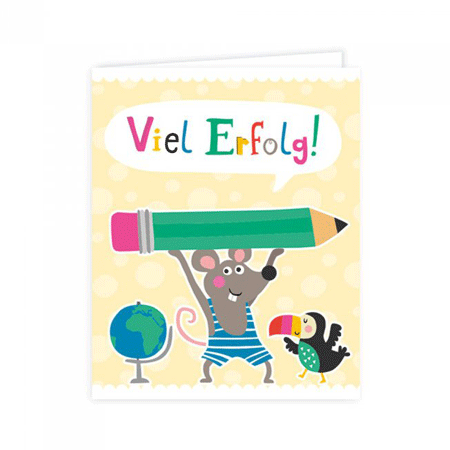 Das hübsche Geschenkkärtchen "Viel Erfolg" ist eine wundervolle Ergänzung für Ihr Geschenk zum Schulanfang. Die Innenseite der kleinen Doppelkarte bietet ausreichend Platz für den Namen des ABC-Schützen. Auf der Vorderseite ist unter der Überschrift "Viel Erfolg!" neben einem Globus eine fröhlich lachende Maus zu sehen, die einen Stift in die Höhe stemmt. Ein lustiger Tukan beobachtet sie dabei. Das Geschenkkärtchen ist sowohl mit Band als auch mit Umschlag erhätlich.