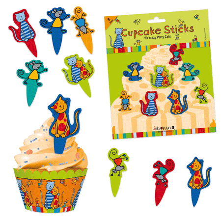 Schöne, lustig bunte Cupcake Sticks SUKU für kleine Katzenliebhaber für die Dekoration Deiner Cupcakes oder Muffins aus dem Hause Lutz Mauder (ca. 6 cm lang inkl. Picker und 1 bis 4 cm breit je nach Figur) - Material: Pappe