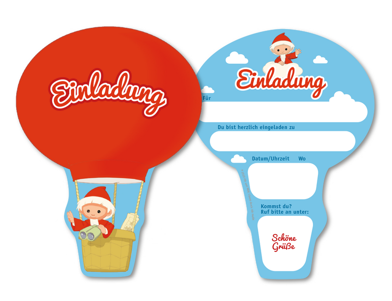 8 Einladungskarten in deutscher Sprache mit Sandmännchen Motiv im Heißluftballon!