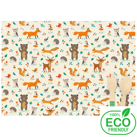 6 Papier-Tischsets Waldtiere. Fuchs, Bär, Rehkitz, Igel, Eule, Pilz, alle Zutaten sind da, um die Kinder zu beeindrucken. Kombiniert mit den Tassen und Serviettenringen entsteht ein schöner Naturtisch.