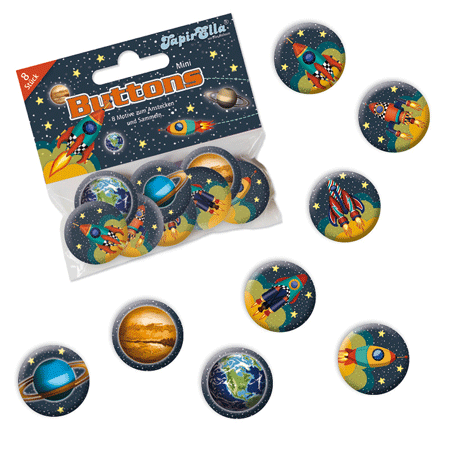 8 Mini Button Weltraum mit Raketen und Planeten Motiv aus dem Hause Lutz Mauder (Tapir Ella)