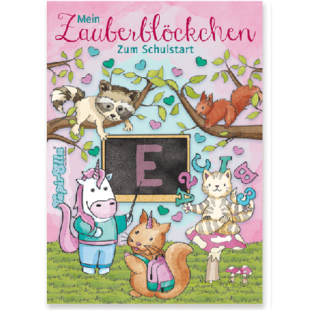 Die weißen Blätter des Zauberblocks "Schulstart" einfach mit einem weichen Bleistift oder Regenbogenstift schraffieren und schon entstehen, wie von Zauberhand, die lustigen Motive.