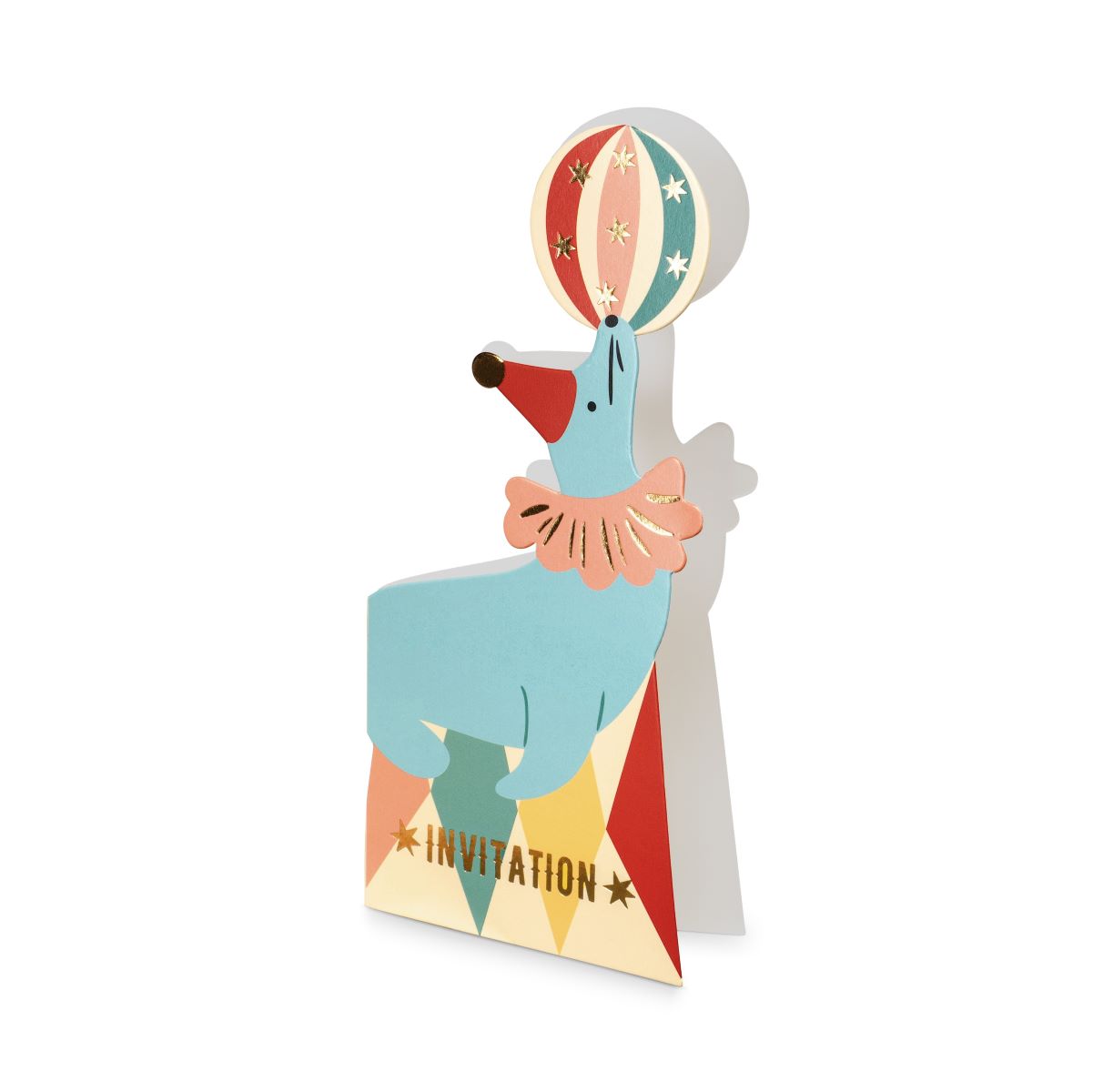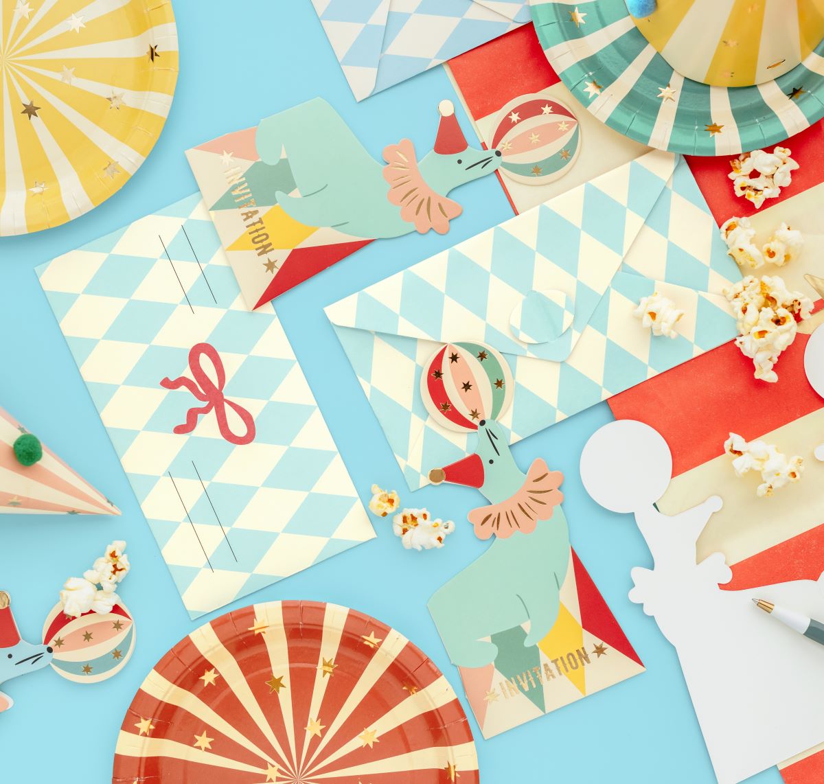 Diese Einladungskarten sind perfekt für eine Zirkusvorstellung oder für die Zirkus Kinderparty. Einladung steht auf englisch "INVITATION" - im innern ist ausreichend Platz für eine individuelle Einladung. Die Umschläge sind passend direkt dabei und in fröhlichen blau-weiß Muster mit rotem Schleifenaufdruck.