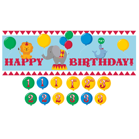Für die Zirkusparty ein Riesenbanner 152 x 51cm) mit Happy Birthday Aufdruck und beigefügten Aufkleber für den 1., 2. oder 3. Geburtstag. In der Verpackung befinden sich jeweils 4 Zahlen je Zahl.